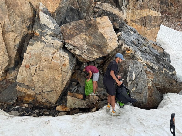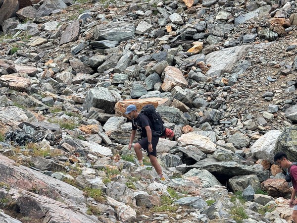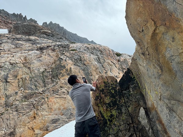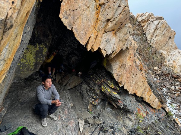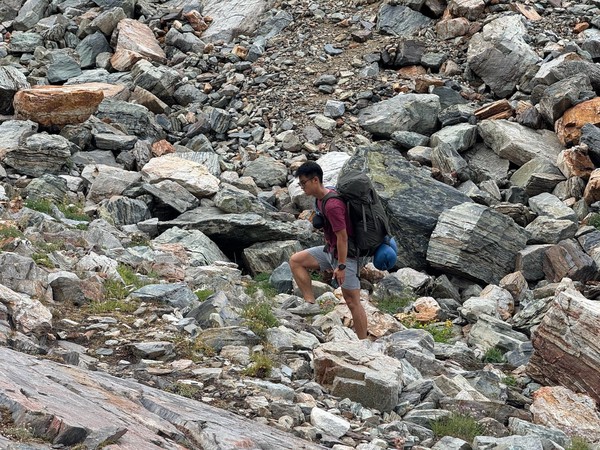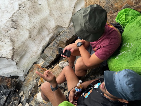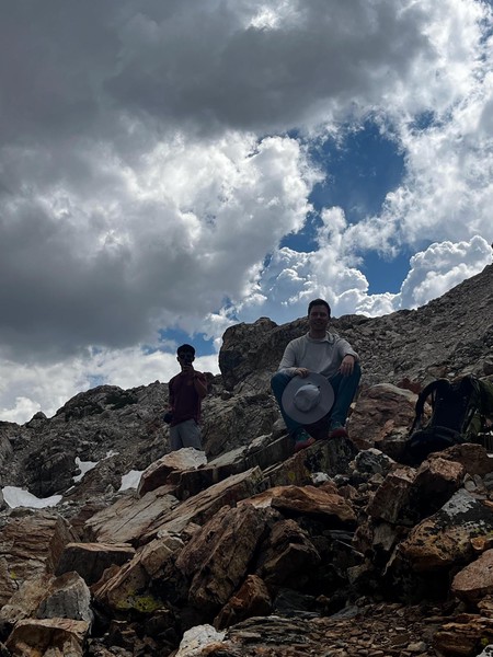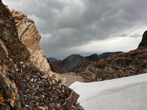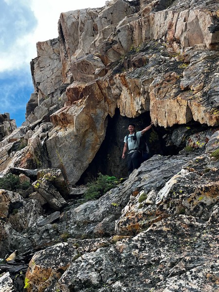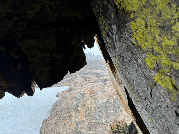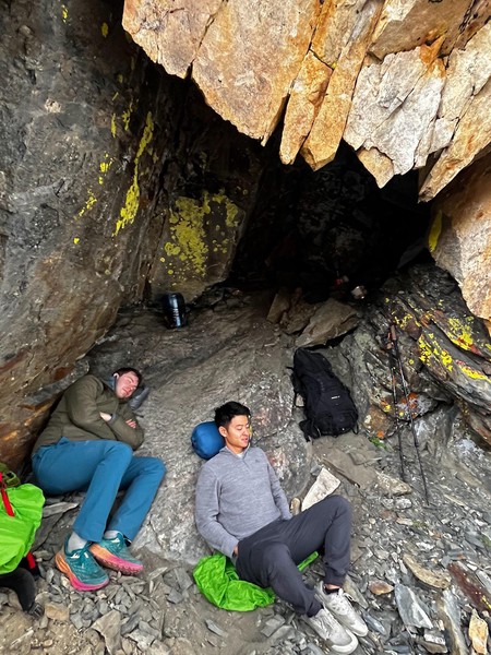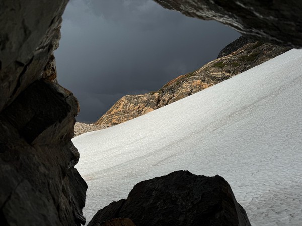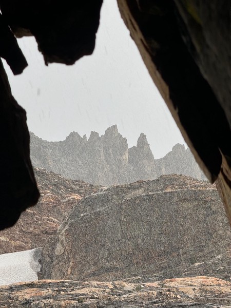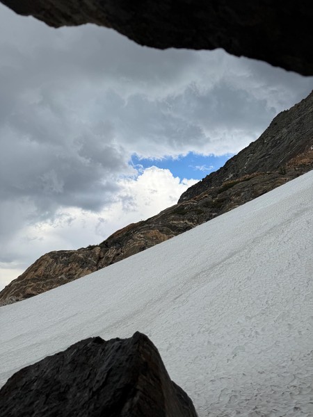 As we reached the first snow field it started to downport. We luckily were able to hide in a cave along the side of the mountain for about an hour and stay dry. While waiting for the rain and hail to stop we cooked some food and took some well deserved rest.