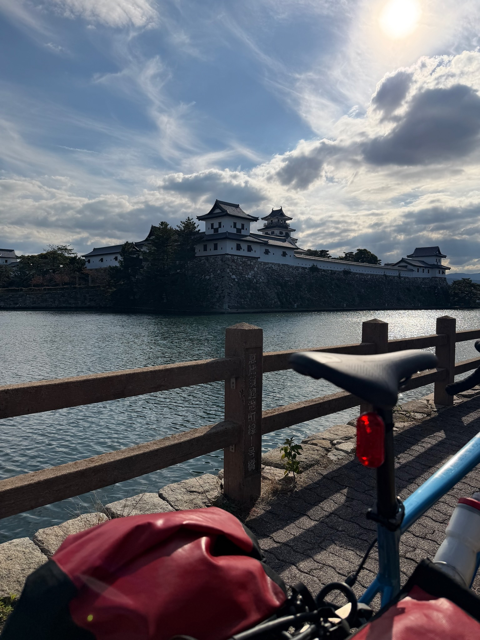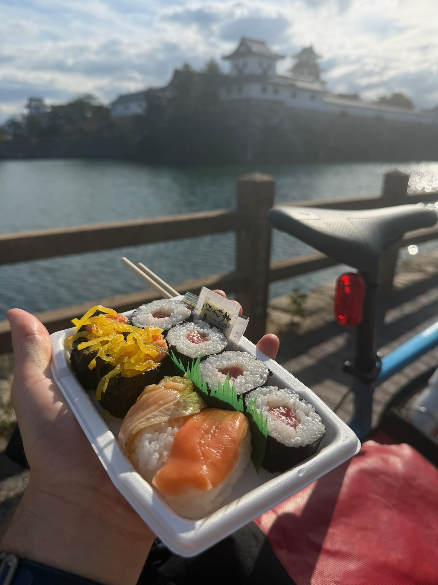 We stopped at Imabari Castle for a late lunch where we found another FamilyMart (a common theme of the trip). I grabbed some sushi and a pork bun. While eating I noticed a second spoke had broken off the back wheel of my bike. I had spotted the first one earlier in the day but figured it was fine. With two gone I was a bit worried about the wheel being overloaded with all the weight in the panniers. As a bandaid fix I taped the broken ones to their adjacent spokes but knew I needed to find a shop before our big ride the next day.