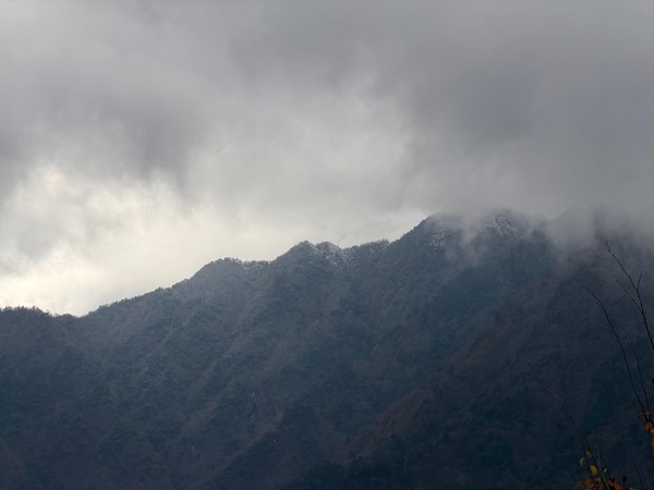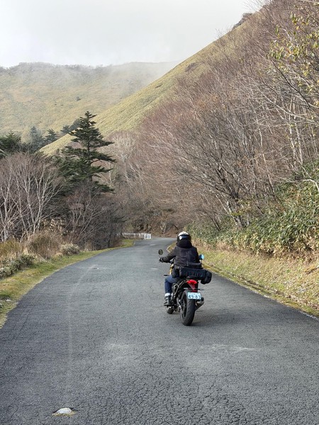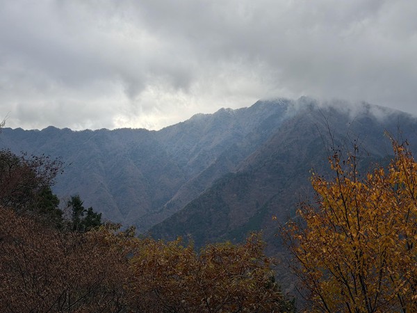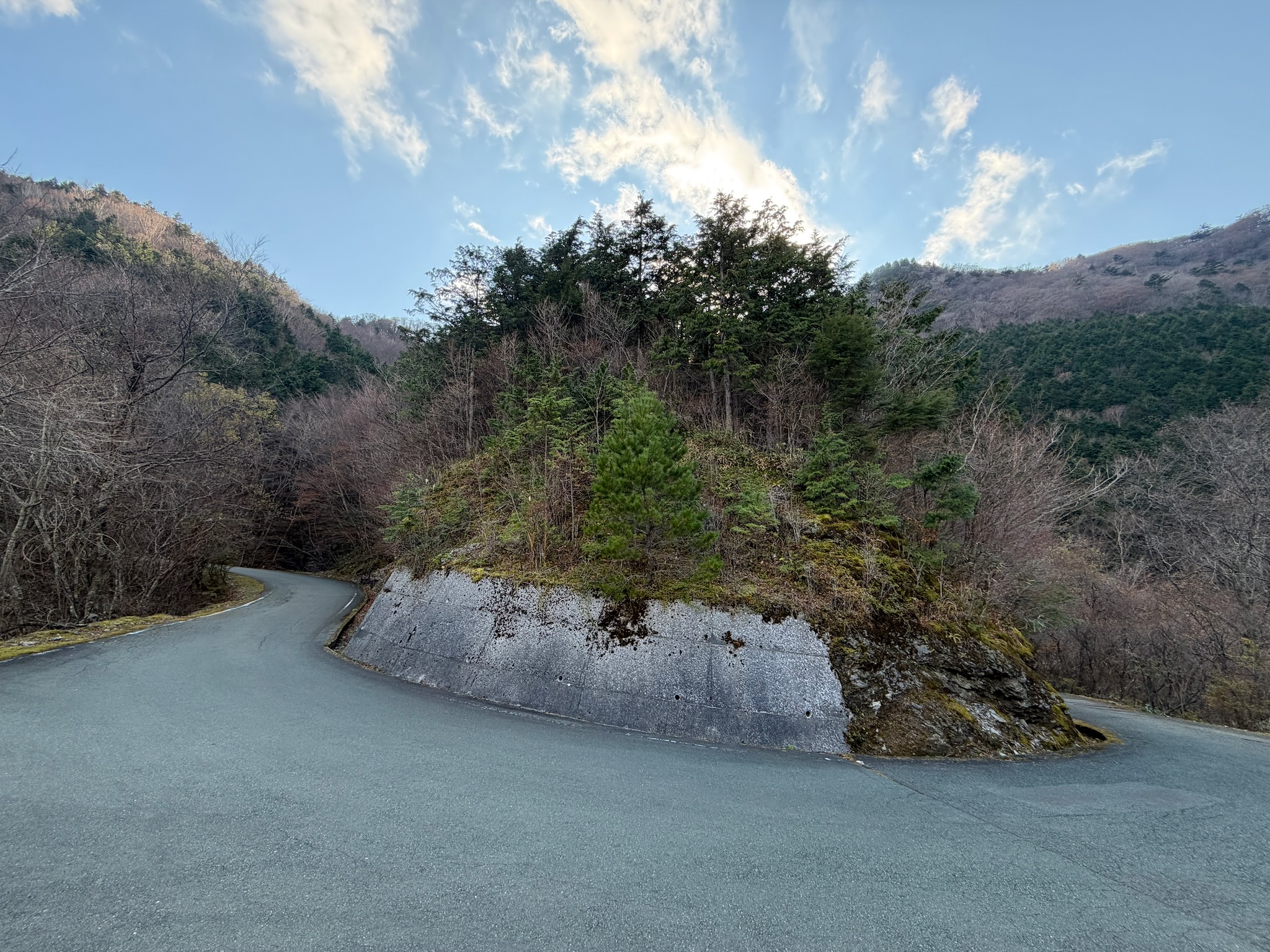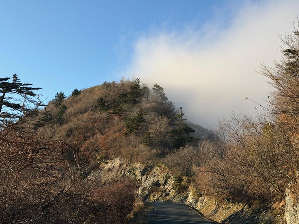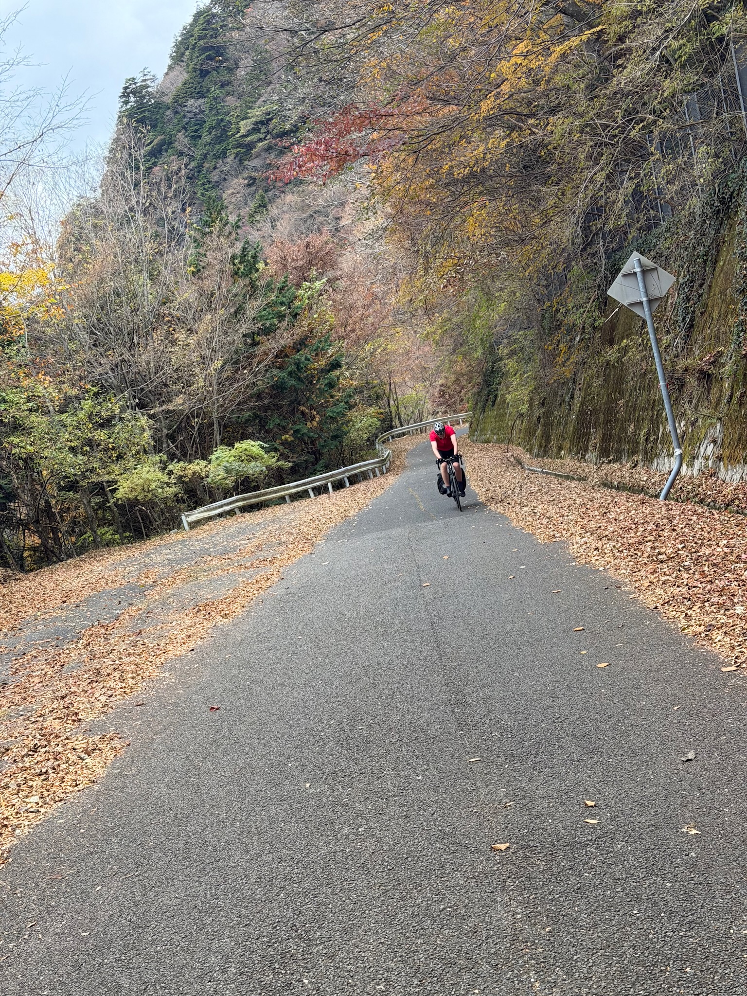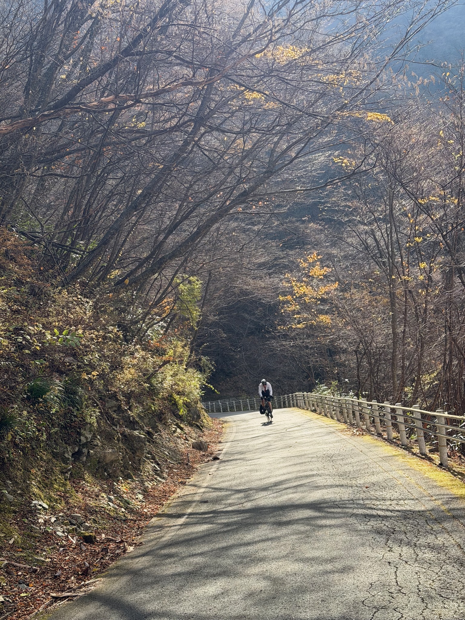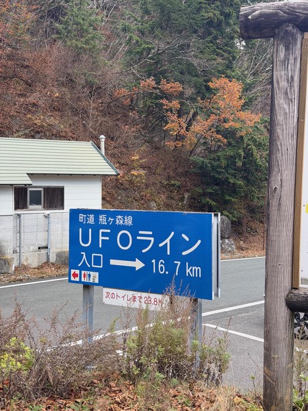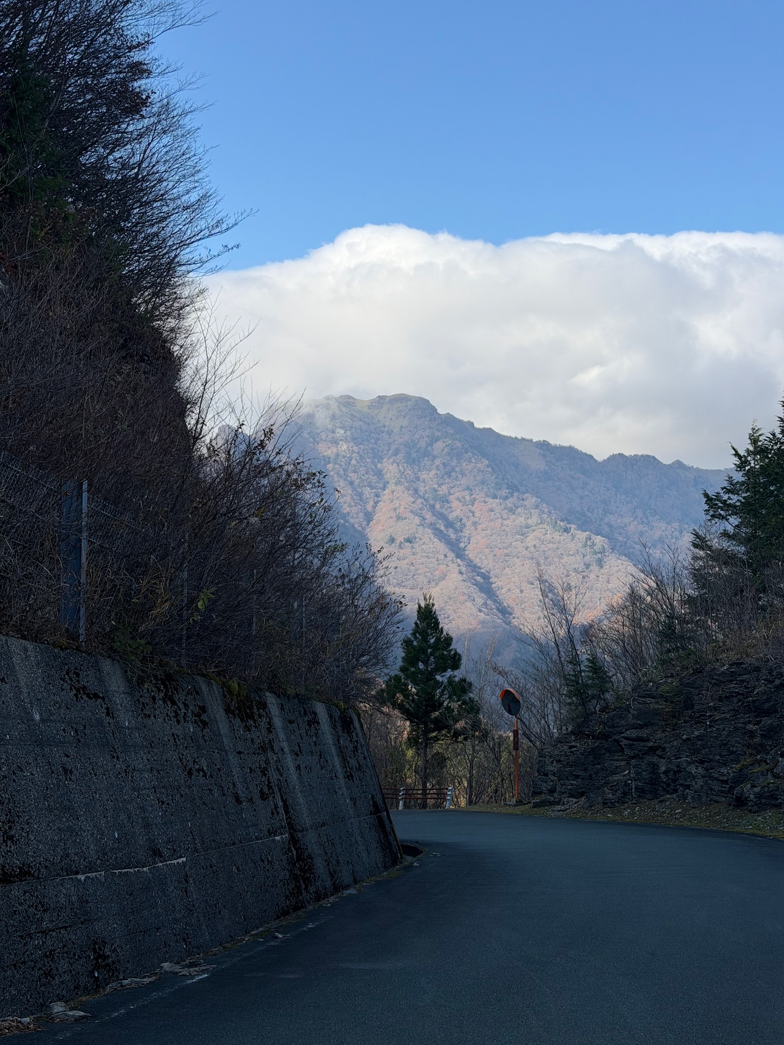 The first bit of riding was pretty easy and then we hit the start of the climb. The road just went up and up through the mountains, passing over rivers of crystal clear water and autumn colours all around. Looking up at the mountains I distinctly noticed how summer faded into fall into winter as the elevation increased. At the peaks of the mountain we could see the trees were frosted from the night before and were covered in white. But down at the bottom it was about 18C. We were on the highway for a while before ducking off onto the road up to the UFO line. This is an older highway that is only really frequented by people who want to go see the UFO line. All major traffic ducks through the main highway that tunnels through the mountainside. Once we were on the smaller road we saw only a few motorcycles going up all day. Slow and steady was the name of the game since it was a very long climb.
